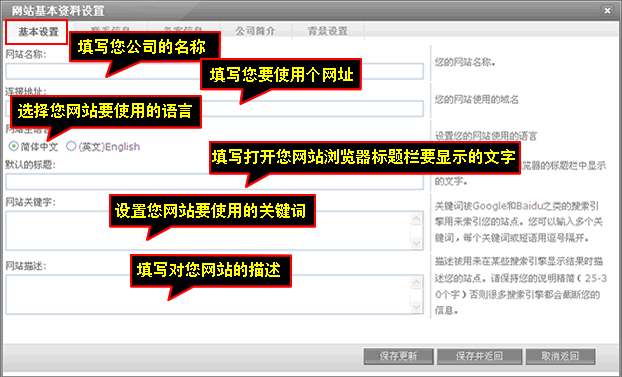 基本设置主要是填写网站名称连接地址网站主语言默认的标题网站关键字网站描述,填写完后记得点击“保存更新”。